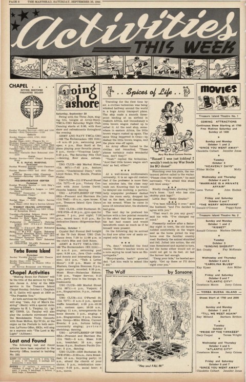 All TREASURE ISLAND Personnel are ARMY & NAVY YMCA-USO- and fell. Jolted into action, the old October 3