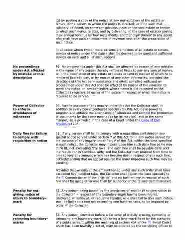 52. Any person being bound by the provisions of section19 to give notice to the Collector in respect of any boundary-mark having been injured, destroyed or removed, or requiring repairs, who shall fail to give such notice, shall be liable to a fine not exceeding one hundred taka, to be imposed by