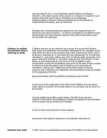 5. Before entering on any lands for the purpose of a survey the Collector shall cause to be published a proclamation addressed to the occupants of the lands which are about to be surveyed and of the conterminous lands, and to