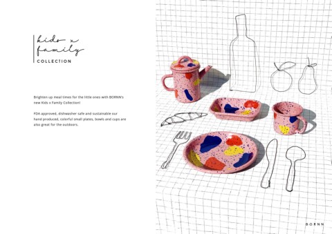 kids x family Brighten up meal times for the little ones with BORNN’s new Kids x Family Collection! FDA approved, dishwasher safe and sustainable our hand produced, colorful small plates, bowls and cups are also great for the outdoors.