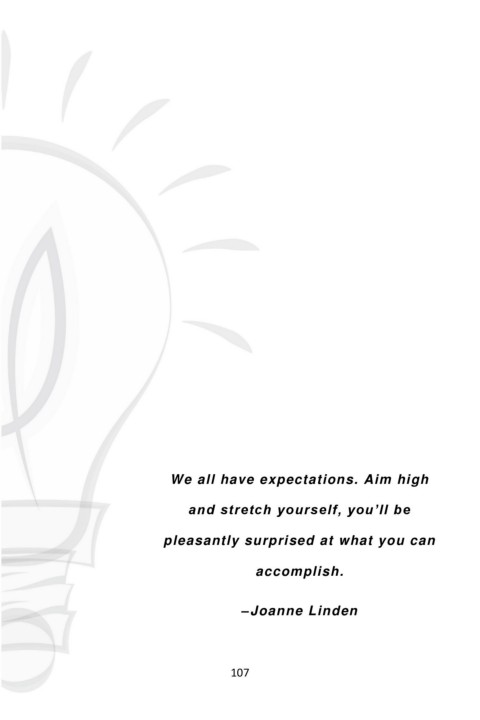 We all have expectations. Aim high and stretch yourself, you’ll be pleasantly surprised at what you can accomplish. –Joanne Linden 107 HOME | NEXT | BACK