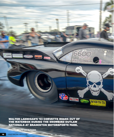 10 WALTER LANNIGAN’S ‘53 CORVETTE ROARS OUT OF THE WATERBOX DURING THE SNOWBIRD OUTLAW NATIONALS AT BRADENTON MOTORSPORTS PARK. photo by JIM WeSlaGer DRAG RACING MAGAZINe JAN - feb 2020 Vol. 1 No. 1