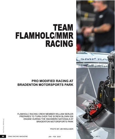 22 TEAM FLAMHOLC/MMR RACING pro modified raCiNG at bradeNtoN motorsports parK FlaMholc racInG creW MeMber WIllIaM Serler prepareS to turn oVer the ScreW bloWn 526 enGIne DurInG the SnoWbIrD natIonalS at braDenton MotorSportS park photo by JIM WeSlaGer DRAG RACING MAGAZINe JAN - feb 2020 Vol. 1 No. 1 Team Flamholc / MMR Racing