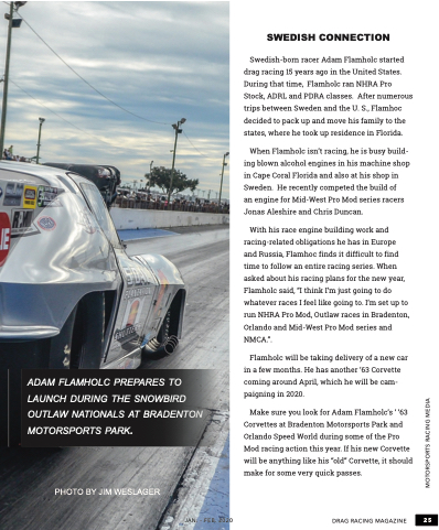 SWEDISH CONNECTION Swedish-born racer Adam Flamholc started drag racing 15 years ago in the United States. During that time, Flamholc ran NHRA Pro Stock, ADRL and PDRA classes. After numerous trips between Sweden and the U. S., Flamhoc decided to pack up and move his family to the states, where he took up residence in Florida. When Flamholc isn’t racing, he is busy build- ing blown alcohol engines in his machine shop in Cape Coral Florida and also at his shop in Sweden. He recently competed the build of an engine for Mid-West Pro Mod series racers Jonas Aleshire and Chris Duncan. With his race engine building work and racing-related obligations he has in Europe and Russia, Flamhoc finds it difficult to find time to follow an entire racing series. When asked about his racing plans for the new year, Flamholc said, “I think I’m just going to do whatever races I feel like going to. I’m set up to run NHRA Pro Mod, Outlaw races in Bradenton, Orlando and Mid-West Pro Mod series and NMCA.”. Flamholc will be taking delivery of a new car in a few months. He has another ‘63 Corvette coming around April, which he will be cam- paigning in 2020. Make sure you look for Adam Flamholc’s ‘ ‘63 Corvettes at Bradenton Motorsports Park and Orlando Speed World during some of the Pro Mod racing action this year. If his new Corvette will be anything like his “old” Corvette, it should make for some very quick passes. adam flamholc prepares to launch during the snowbird outlaw nationals at bradenton motorsports park. photo by JIM WeSlaGer JAN. - feb. 2020 DRAG RACING MAGAZINE 25 MOTORSPORTS RACING MEDIA