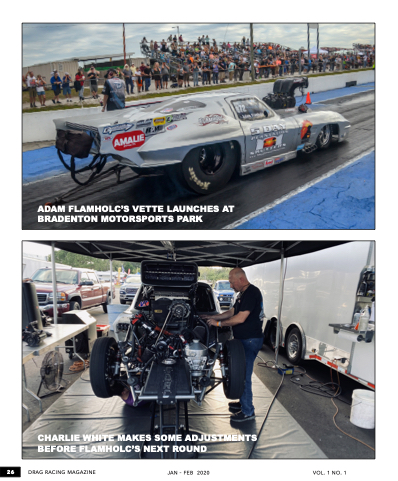 FLAMHOLC’S SCREW BLOWN ADAM FLAMHOLC’S VETTE LAUNCHES AT ‘63 VETTE AT BRADENTON BRADENTON MOTORSPORTS PARK CHARLIE WHITE MAKES SOME ADJUSTMENTS BEFORE FLAMHOLC’S NEXT ROUND 26 DRAG RACING MAGAZINe JAN - feb 2020 Vol. 1 No. 1