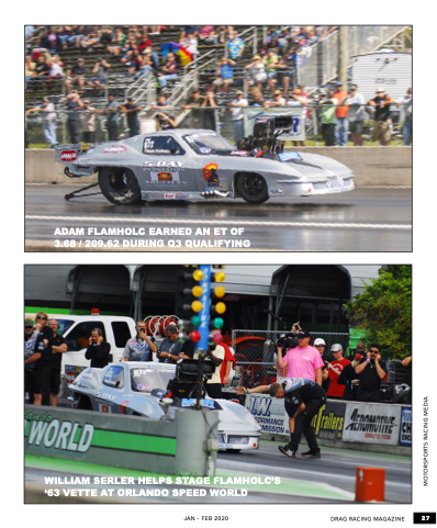 ADAM FLAMHOLC EARNED AN ET OF 3.68 / 209.62 DURING Q3 QUALIFYING WILLIAM SERLER HELPS STAGE FLAMHOLC’S ‘63 VETTE AT ORLANDO SPEED WORLD JAN - feb 2020 DRAG RACING MAGAZINE 27 MOTORSPORTS RACING MEDIA