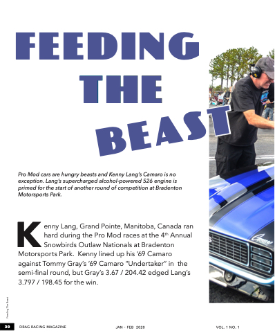 30 FEEDING THE Pro Mod cars are hungry beasts and Kenny Lang’s Camaro is no exception. Lang’s supercharged alcohol-powered 526 engine is primed for the start of another round of competition at Bradenton Motorsports Park. Kenny Lang, Grand Pointe, Manitoba, Canada ran hard during the Pro Mod races at the 4th Annual Snowbirds Outlaw Nationals at Bradenton Motorsports Park. Kenny lined up his ‘69 Camaro against Tommy Gray’s ‘69 Camaro “Undertaker” in the semi-final round, but Gray’s 3.67 / 204.42 edged Lang’s 3.797 / 198.45 for the win. DRAG RACING MAGAZINe JAN - feb 2020 Vol. 1 No. 1 BEAST Feeding The Beast