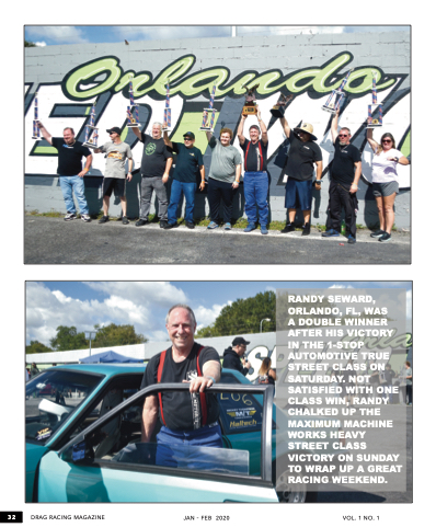 RANDY SEWARD, ORLANDO, FL, WAS A DOUBLE WINNER AFTER HIS VICTORY IN THE 1-STOP AUTOMOTIVE TRUE STREET CLASS ON SATURDAY. NOT SATISFIED WITH ONE CLASS WIN, RANDY CHALKED UP THE MAXIMUM MACHINE WORKS HEAVY STREET CLASS VICTORY ON SUNDAY TO WRAP UP A GREAT RACING WEEKEND. 32 DRAG RACING MAGAZINe JAN - feb 2020 Vol. 1 No. 1
