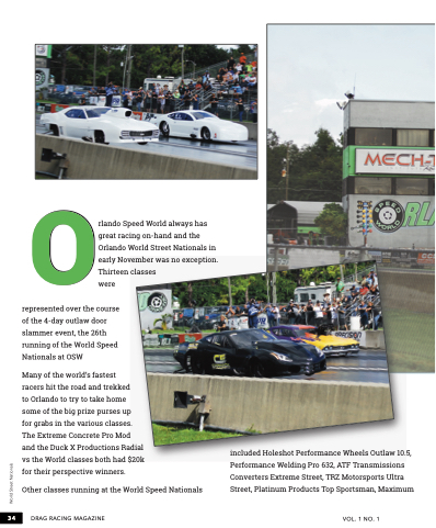 34 Orlando Speed World always has great racing on-hand and the Orlando World Street Nationals in early November was no exception. Thirteen classes were represented over the course of the 4-day outlaw door slammer event, the 26th running of the World Speed Nationals at OSW Many of the world’s fastest racers hit the road and trekked to Orlando to try to take home some of the big prize purses up for grabs in the various classes. The Extreme Concrete Pro Mod and the Duck X Productions Radial vs the World classes both had $20k for their perspective winners. Other classes running at the World Speed Nationals included Holeshot Performance Wheels Outlaw 10.5, Performance Welding Pro 632, ATF Transmissions Converters Extreme Street, TRZ Motorsports Ultra Street, Platinum Products Top Sportsman, Maximum DRAG RACING MAGAZINE Vol. 1 No. 1 World Street Nationals