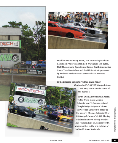35 Machine Works Heavy Street, JKR Inc Racing Products 8.50 Index, Prater Radiator Inc & Warehouse 10.0 Index, BME Photography Open Comp, Sander Smith Automotive Group True Street class and the NT Shootout sponsored by Reuben’s Performance Center and Eric Kenward Racing. In the Extreme Concrete Pro Mod class, Randy Weatherford ’s 3.63/207.98 edged Jason Lee’s 3.65/206.20 to take home all the marbles. In the Duck X Productions, Radial vs the World class, Melanie Salemi’s new ‘19 Camaro, dubbed “Purple Reign Sidepiece” nicked Stevie “Fast” Jackson to chalk up the victory. Melanie Salemi’s ET of 3.583 edged Jackson’s 3.585. The key to Salemi’s narrow victory was her .007 reaction time to Jackson’s .047, which put her in the win column of the World Street Nationals. JAN - feb 2020 DRAG RACING MAGAZINE MOTORSPORTS RACING MEDIA