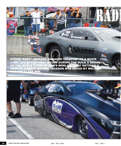 STEVIE “FAST” JACKSON MANAGED “SHADOW” TO A QUICK 3.585 / 213 IN THE FINAL ROUND DURING THE DUCK X RADIAL VS THE WORLD CLASS AT OSW’S WORLD STREET NATIONALS. DESPITE A GREAT EFFORT, JACKSON WAS EDGED BY MELANIE FOR THE CLASS WIN. rad 36 DRAG RACING MAGAZINe JAN - feb 2020 Vol. 1 No. 1 i