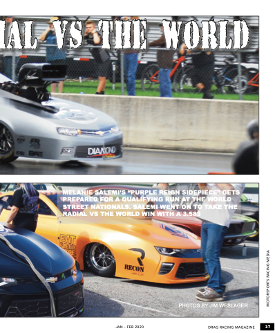 al vs the world   MELANIE SALEMI’S “PURPLE REIGN SIDEPIECE” GETS PREPARED FOR A QUALIFYING RUN AT THE WORLD STREET NATIONALS. SALEMI WENT ON TO TAKE THE RADIAL VS THE WORLD WIN WITH A 3.583 photoS by JIM WeSlaGer 37    di JAN - feb 2020 DRAG RACING MAGAZINE MOTORSPORTS RACING MEDIA