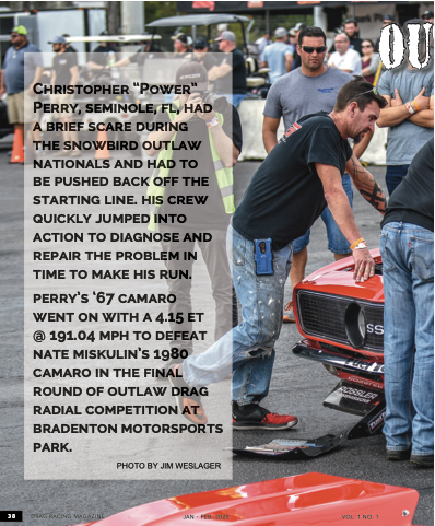 O Christopher “Power” Perry, seminole, fl, had a brief scare during the snowbird outlaw nationals and had to be pushed back off the starting line. his crew quickly jumped into action to diagnose and repair the problem in time to make his run. perry’s ‘67 camaro went on with a 4.15 et @ 191.04 mph to defeat nate miskulin’s 1980 camaro in the final round of outlaw drag radial competition at bradenton motorsports park. photo by JIM WeSlaGer 38 DRAG RACING MAGAZINe JAN - feb 2020 Vol. 1 No. 1 UT