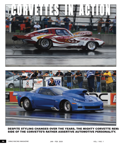 CORVETTES IN ACTION 46 DESPITE STYLING CHANGES OVER THE YEARS, THE MIGHTY CORVETTE REMA SIDE OF THE CORVETTE’S RATHER ASSERTIVE AUTOMOTIVE PERSONALITY. DRAG RACING MAGAZINe JAN - feb 2020 Vol. 1 No. 1
