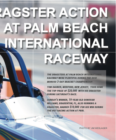 AGSTER ACTION AT PALM BEACH INTERNATIONAL RACEWAY the dragsters at palM beaCh international raCeway were plentiFul during the diCk Moroso 3-day braCket ChaMpionship. toM dauber, MedFord, new Jersey, took hoMe the top prize oF $20,000 with his dragster during saturday’s raCe. sunday’s winner, 19-year old donovan williaMs, bradenton, Fl, also running a dragster, nabbed $10,000 For his win during the hot raCing aCtion at pbir. photo by JIM WeSlaGer R