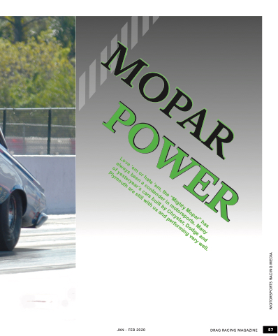 JAN - feb 2020 DRAG RACING MAGAZINe 57 MOPAR POWER Love ‘em or hate ‘em, the “Mighty Mopar” has always been a contender in motorsports. Many of yesteryear’s cars built by Chrysler, Dodge and Plymouth are still with us and performing very well. MOTORSPORTS RACING MeDIA