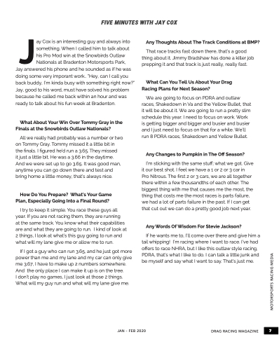Jay Cox is an interesting guy and always into something. When I called him to talk about his Pro Mod win at the Snowbirds Outlaw Nationals at Bradenton Motorsports Park, Jay answered his phone and he sounded as if he was doing some very imporant work.. “Hey, can I call you back buddy, I’m kinda busy with something right now?” Jay, good to his word, must have solved his problem because he called me back within an hour and was ready to talk about his fun week at Bradenton. What About Your Win Over Tommy Gray in the FInals at the Snowbirds Outlaw Nationals? All we really had probably was a number or two on Tommy Gray. Tommy missed it a little bit in the finals. I figured he’d run a 3.65. They missed it just a little bit. He was a 3.66 in the daytime. And we were set up to go 3.65. It was good man, anytime you can go down there and test and bring home a little money, that’s always nice. How Do You Prepare? What’s Your Game Plan, Especially Going Into a Final Round? I try to keep it simple. You race these guys all year. If you are not racing them, they are running at the same track. You know what their capabilities are and what they are going to run. I kind of look at 2 things, I look at what’s this guy going to run and what will my lane give me or allow me to run. If I got a guy who can run 3.65, and he just got more power than me and my lane and my car can only give me 3.67, I have to make up 2 numbers somewhere. And the only place I can make it up is on the tree. I don’t play no games, I just look at those 2 things. What will my guy run and what will my lane give me. Any Thoughts About The Track Conditions at BMP? That race tracks fast down there, that’s a good thing about it. Jimmy Bradshaw has done a killer job prepping it and that track is just really, really fast. What Can You Tell Us About Your Drag Racing Plans for Next Season? We are going to focus on PDRA and outlaw races, Shakedown in Va and the Yellow Bullet, that it will be about it. We are going to run a pretty slim schedule this year. I need to focus on work. Work is getting bigger and bigger and busier and busier and I just need to focus on that for a while. We’ll run 8 PDRA races, Shakedown and Yellow Bullet. Any Changes to Pumpkin in The Off Season? I’m sticking with the same stuff; what we got. Give it our best shot. I feel we have a 1 or 2 or 3 car in Pro Nitrous. The first 2 or 3 cars, we are all together there within a few thousandths of each other. The biggest thing with me that causes me the most, the thing that costs me the most races is parts failure, we had a lot of parts failure in the past. If I can get that cut out we can do a pretty good job next year. Any Words Of Wisdom For Stevie Jackson? If he wants me to, I’ll come over there and give him a tail whipping! I’m racing where I want to race. I’ve had offers to race NHRA, but I like this outlaw style racing, PDRA, that’s what I like to do. I can talk a little junk and be myself and say what I want to say. That’s just me. Five Minutes with Jay Cox JAN - feb 2020 DRAG RACING MAGAZINE 7 Five Minutes with Jay Cox MOTORSPORTS RACING MEDIA