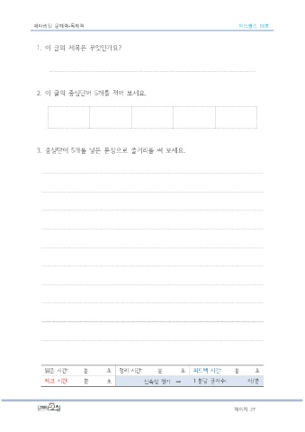 메타리딩 문해력•독해력 어드밴스 19호 1. 이 글의 제목은 무엇인가요? 2. 이 글의 중심단어 5개를 적어 보세요. 3. 중심단어 5개를 넣은 문장으로 줄거리를 써 보세요. 읽은 시간: 분 초 정리 시간: 분 초 피드백 시간: 분 초 체크 시간: 분 초 신속성 평가 ⇒ 1 분당 글자수: 자/분 페이지 27