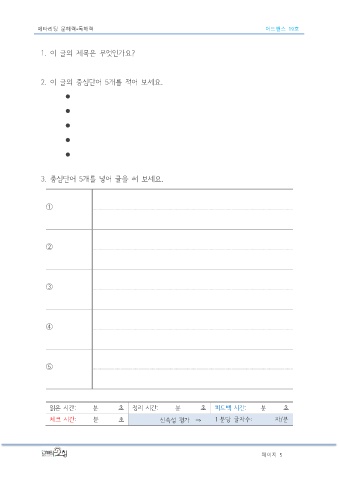 메타리딩 문해력•독해력 어드밴스 19호 1. 이 글의 제목은 무엇인가요? 2. 이 글의 중심단어 5개를 적어 보세요. ⚫ ⚫ ⚫ ⚫ ⚫ 3. 중심단어 5개를 넣어 글을 써 보세요. ① ② ③ ④ ⑤ 읽은 시간: 분 초 정리 시간: 분 초 피드백 시간: 분 초 체크 시간: 분 초 신속성 평가 ⇒ 1 분당 글자수: 자/분 페이지 5