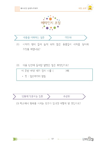 메타리딩 문해력•독해력 시드 20호 메타인지 코칭 내용을 이해하는 질문 객관화 (1) 사자가 병이 들어 눕게 되자 많은 동물들이 사자를 찾아와 무엇을 하였나요? (2) 다음 빈칸에 들어갈 알맞은 말은 무엇인가요? 이 못된 녀석! 네가 감히 나를 ( )해! • 뜻 : 업신여기어 깔봄 생활에 적용하는 질문 주관화 (3) 학교에서 왕따를 시키는 친구가 있다면 어떻게 할 것인가요? 17