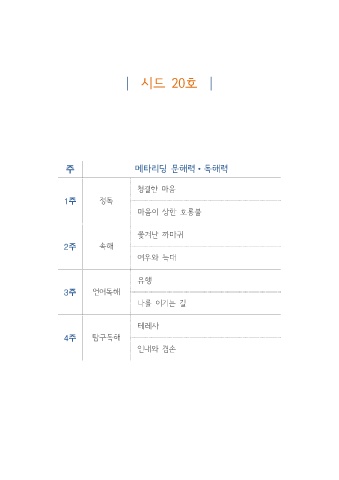 메타리딩 문해력•독해력 시드 20호 │ 시드 20호 │ 주 메타리딩 문해력•독해력 청결한 마음 1주 정독 마음이 상한 호롱불 쫓겨난 까마귀 2주 속해 여우와 늑대 유행 3주 언어독해 나를 이기는 길 테레사 4주 탐구독해 인내와 겸손 2