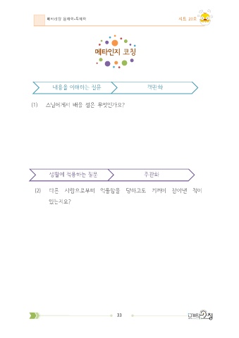 메타리딩 문해력•독해력 시드 20호 메타인지 코칭 내용을 이해하는 질문 객관화 (1) 스님에게서 배울 점은 무엇인가요? 생활에 적용하는 질문 주관화 (2) 다른 사람으로부터 억울함을 당하고도 기꺼이 참아낸 적이 있는지요? 33