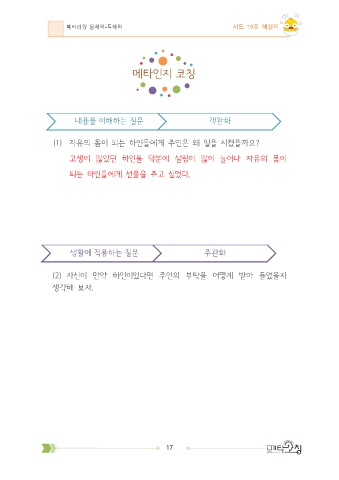 메타리딩 문해력•독해력 시드 19호 해설지 메타인지 코칭 내용을 이해하는 질문 객관화 (1) 자유의 몸이 되는 하인들에게 주인은 왜 일을 시켰을까요? 고생이 많았던 하인들 덕분에 살림이 많이 늘어나 자유의 몸이 되는 하인들에게 선물을 주고 싶었다. 생활에 적용하는 질문 주관화 (2) 자신이 만약 하인이었다면 주인의 부탁을 어떻게 받아 들였을지 생각해 보자. 17