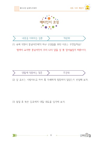 메타리딩 문해력•독해력 시드 19호 해설지 메타인지 코칭 내용을 이해하는 질문 객관화 (1) 슈퍼 직원이 동남아인에게 마구 신경질을 부린 이유는 무엇일까요? 행색이 초라한 동남아인이 우리 나라 말을 잘 못 알아들었기 때문이다. 생활에 적용하는 질문 주관화 (2) 잘 모르는 사람이라고 하여 혹 무례하게 행동하지 않았는지 반성해 보자. (3) 통일 후 북한 동포에게 대할 태도를 생각해 보자. 9