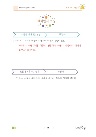메타리딩 문해력•독해력 시드 20호 해설지 메타인지 코칭 내용을 이해하는 질문 객관화 (1) 까마귀가 까마귀 마을에서 쫓겨난 이유는 무엇인가요? 까마귀가 비둘기처럼 하얗게 변장하여 비둘기 마을에서 살다가 쫓겨났기 때문이다. 생활에 적용하는 질문 주관화 (2) 다른 사람을 흉내 내어 피해를 본 적이 없는지 생각해 봅시다. 14