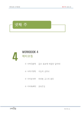 메타코칭 인지훈련 베이직 2025-05 넷째 주 WORKBOOK 4 메타코칭 4 메타집중력 꿈과 목표에 마음을 담아라! 메타기억력 자동차 콩쿠르 메타분석력 마라톤 코스의 종류 메타독해력 조륙운동 페이지 33