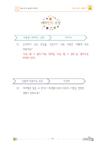 메타리딩 문해력•독해력 시드 21호 해설지 메타인지 코칭 내용을 이해하는 질문 객관화 (1) 승리자가 되는 첫걸음, 성공자가 되는 비결은 어떻게 하는 것일까요? ‘나는 할 수 없다.’라는 생각을 ‘나는 할 수 있다.’는 생각으로 바꿔야 한다. 생활에 적용하는 질문 주관화 (2) 어려웠던 일을 나 혼자서 해결함으로써 성공의 기쁨을 얻었던 경험이 있었나요? 17