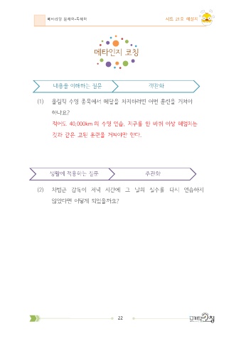 메타리딩 문해력•독해력 시드 21호 해설지 메타인지 코칭 내용을 이해하는 질문 객관화 (1) 올림픽 수영 종목에서 메달을 차지하려면 어떤 훈련을 거쳐야 하나요? 적어도 40,000km 의 수영 연습, 지구를 한 바퀴 이상 헤엄치는 것과 같은 고된 훈련을 거쳐야만 한다. 생활에 적용하는 질문 주관화 (2) 차범근 감독이 저녁 시간에 그 날의 실수를 다시 연습하지 않았다면 어떻게 되었을까요? 22