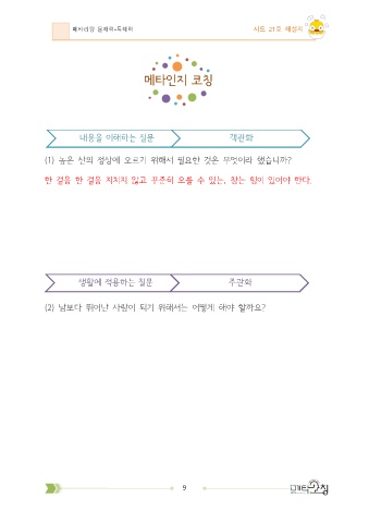 메타리딩 문해력•독해력 시드 21호 해설지 메타인지 코칭 내용을 이해하는 질문 객관화 (1) 높은 산의 정상에 오르기 위해서 필요한 것은 무엇이라 했습니까? 한 걸음 한 걸음 지치지 않고 꾸준히 오를 수 있는, 참는 힘이 있어야 한다. 생활에 적용하는 질문 주관화 (2) 남보다 뛰어난 사람이 되기 위해서는 어떻게 해야 할까요? 9