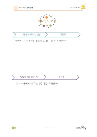 메타코칭 인지훈련 시드 2025-05 메타인지 코칭 내용을 이해하는 질문 객관화 (1) 할아버지가 하루하루 즐겁게 보내는 이유는 무엇인가? 생활에 적용하는 질문 주관화 (2) 나리꽃에게 해 주고 싶은 말은 무엇인가? 14