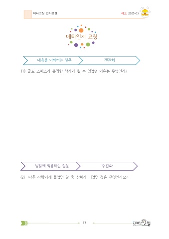 메타코칭 인지훈련 시드 2025-05 메타인지 코칭 내용을 이해하는 질문 객관화 (1) 골드 스미스가 유명한 작가가 될 수 있었던 이유는 무엇인가? 생활에 적용하는 질문 주관화 (2) 다른 사람에게 들었던 말 중 상처가 되었던 것은 무엇인가요? 17