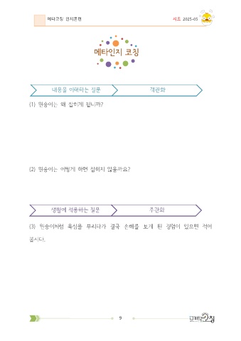 메타코칭 인지훈련 시드 2025-05 메타인지 코칭 내용을 이해하는 질문 객관화 (1) 원숭이는 왜 잡히게 됩니까? (2) 원숭이는 어떻게 하면 잡히지 않을까요? 생활에 적용하는 질문 주관화 (3) 원숭이처럼 욕심을 부리다가 결국 손해를 보게 된 경험이 있으면 적어 봅시다. 9