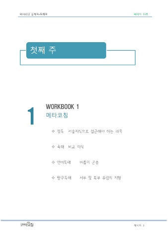 메타리딩 문해력•독해력 베이직 19호 첫째 주 WORKBOOK 1 메타코칭 1 정독 서술지식으로 접근해야 하는 과목 속해 비교 의식 언어독해 여름의 곤충 탐구독해 서부 및 북부 유럽의 지형 페이지 3