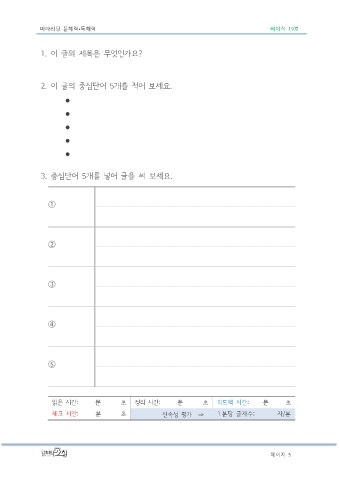 메타리딩 문해력•독해력 베이직 19호 1. 이 글의 제목은 무엇인가요? 2. 이 글의 중심단어 5개를 적어 보세요. ⚫ ⚫ ⚫ ⚫ ⚫ 3. 중심단어 5개를 넣어 글을 써 보세요. ① ② ③ ④ ⑤ 읽은 시간: 분 초 정리 시간: 분 초 피드백 시간: 분 초 체크 시간: 분 초 신속성 평가 ⇒ 1 분당 글자수: 자/분 페이지 5