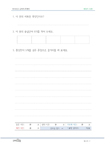 메타리딩 문해력•독해력 베이직 19호 1. 이 글의 제목은 무엇인가요? 2. 이 글의 중심단어 5개를 적어 보세요. 3. 중심단어 5개를 넣은 문장으로 줄거리를 써 보세요. 읽은 시간: 분 초 정리 시간: 분 초 피드백 시간: 분 초 체크 시간: 분 초 신속성 평가 ⇒ 1 분당 글자수: 자/분 페이지 7