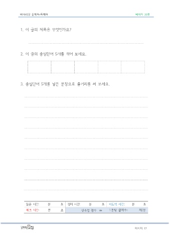 메타리딩 문해력•독해력 베이직 20호 1. 이 글의 제목은 무엇인가요? 2. 이 글의 중심단어 5개를 적어 보세요. 3. 중심단어 5개를 넣은 문장으로 줄거리를 써 보세요. 읽은 시간: 분 초 정리 시간: 분 초 피드백 시간: 분 초 체크 시간: 분 초 신속성 평가 ⇒ 1 분당 글자수: 자/분 페이지 17