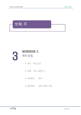 메타리딩 문해력•독해력 베이직 20호 셋째 주 WORKBOOK 3 메타코칭 3  정독 마감 효과  속해 가장 소중한 것  언어독해 정의  탐구독해 남부 유럽의 지형 페이지 23