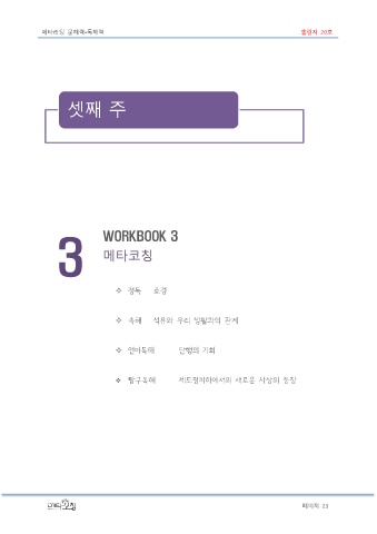 메타리딩 문해력•독해력 챌린지 20호 셋째 주 WORKBOOK 3 메타코칭 3  정독 효경  속해 석유와 우리 생활과의 관계  언어독해 단행의 기회  탐구독해 세도정치하에서의 새로운 사상의 등장 페이지 23