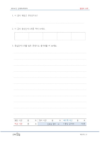 메타리딩 문해력•독해력 챌린지 20호 1. 이 글의 제목은 무엇인가요? 2. 이 글의 중심단어 5개를 적어 보세요. 3. 중심단어 5개를 넣은 문장으로 줄거리를 써 보세요. 읽은 시간: 분 초 정리 시간: 분 초 피드백 시간: 분 초 체크 시간: 분 초 신속성 평가 ⇒ 1 분당 글자수: 자/분 페이지 37