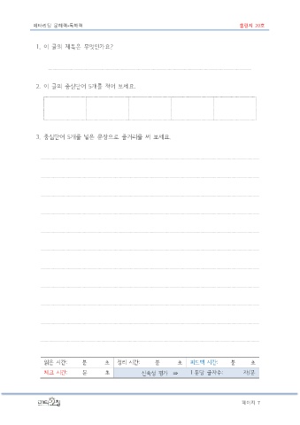 메타리딩 문해력•독해력 챌린지 20호 1. 이 글의 제목은 무엇인가요? 2. 이 글의 중심단어 5개를 적어 보세요. 3. 중심단어 5개를 넣은 문장으로 줄거리를 써 보세요. 읽은 시간: 분 초 정리 시간: 분 초 피드백 시간: 분 초 체크 시간: 분 초 신속성 평가 ⇒ 1 분당 글자수: 자/분 페이지 7