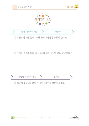 메타리딩 문해력•독해력 시드 19호 메타인지 코칭 내용을 이해하는 질문 객관화 (1) 노인이 금고를 집에 가져다 놓자 아들들은 어떻게 했나요? (2) 노인이 금고를 통해 세 아들에게 하고 싶었던 말은 무엇인가요? 생활에 적용하는 질문 주관화 (3) 최근에 부모님과 같이 한 것이 무엇인지 생각해 보세요. 22