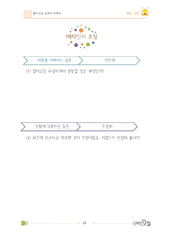 메타리딩 문해력•독해력 시드 19호 메타인지 코칭 내용을 이해하는 질문 객관화 (1) 팔머스틴 수상에게서 본받을 점은 무엇인가? 생활에 적용하는 질문 주관화 (2) 최근에 친구하고 약속한 것이 무엇이었고, 지켰는지 반성해 봅시다. 25