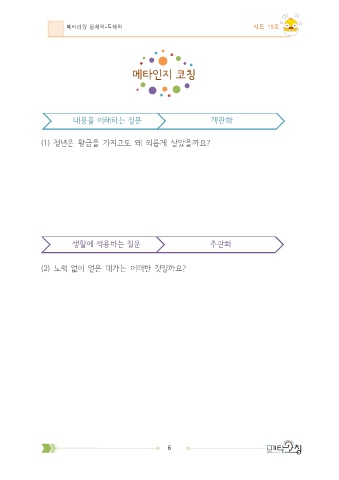 메타리딩 문해력•독해력 시드 19호 메타인지 코칭 내용을 이해하는 질문 객관화 (1) 청년은 황금을 가지고도 왜 외롭게 살았을까요? 생활에 적용하는 질문 주관화 (2) 노력 없이 얻은 대가는 어떠한 것일까요? 6