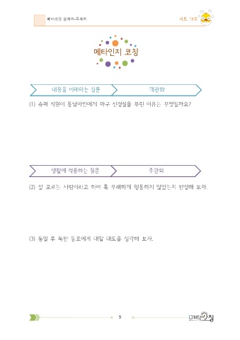 메타리딩 문해력•독해력 시드 19호 메타인지 코칭 내용을 이해하는 질문 객관화 (1) 슈퍼 직원이 동남아인에게 마구 신경질을 부린 이유는 무엇일까요? 생활에 적용하는 질문 주관화 (2) 잘 모르는 사람이라고 하여 혹 무례하게 행동하지 않았는지 반성해 보자. (3) 통일 후 북한 동포에게 대할 태도를 생각해 보자. 9
