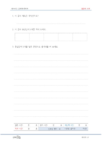 메타리딩 문해력•독해력 챌린지 21호 1. 이 글의 제목은 무엇인가요? 2. 이 글의 중심단어 5개를 적어 보세요. 3. 중심단어 5개를 넣은 문장으로 줄거리를 써 보세요. 읽은 시간: 분 초 정리 시간: 분 초 피드백 시간: 분 초 체크 시간: 분 초 신속성 평가 ⇒ 1 분당 글자수: 자/분 페이지 37