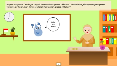 Bu guru manjawab, “Air hujan terjadi karena adanya proses siklus air”. “Untuk lebih jelasnya mengenai proses turunnya air hujan, mari ikuti perjalanan Banyu dalam proses siklus air!” Halo, aku Banyu 6